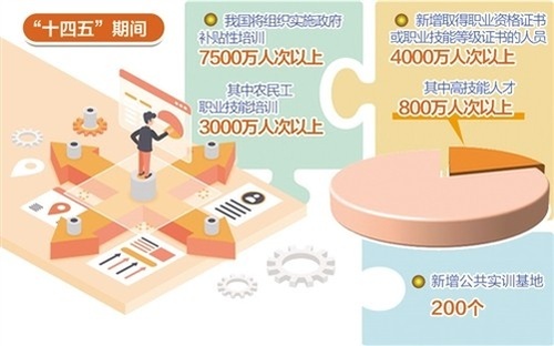 為提升勞動者就業(yè)創(chuàng)業(yè)能力,滿足產(chǎn)業(yè)轉(zhuǎn)型升級和技術(shù)進(jìn)步的要求,“十四五”期間,我國將組織實(shí)施政府補(bǔ)貼性培訓(xùn)達(dá)7500萬人次以上,其中農(nóng)民工職業(yè)技能培訓(xùn)3000萬人次以上;新增取得職業(yè)資格證書或職業(yè)技能等級證書的人員達(dá)到4000萬人次以上,其中能夠達(dá)到高級技工、技師、高級技師的高技能人才達(dá)到800萬人次以上;新增公共實(shí)訓(xùn)基地200個。