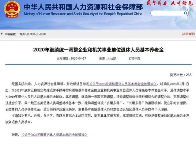 經(jīng)國務(wù)院批準(zhǔn),人力資源社會保障部、財(cái)政部近日印發(fā)《關(guān)于2020年調(diào)整退休人員基本養(yǎng)老金的通知》,明確從2020年1月1日起,為2019年底前已按規(guī)定辦理退休手續(xù)并按月領(lǐng)取基本養(yǎng)老金的企業(yè)和機(jī)關(guān)事業(yè)單位退休人員提高基本養(yǎng)老金水...