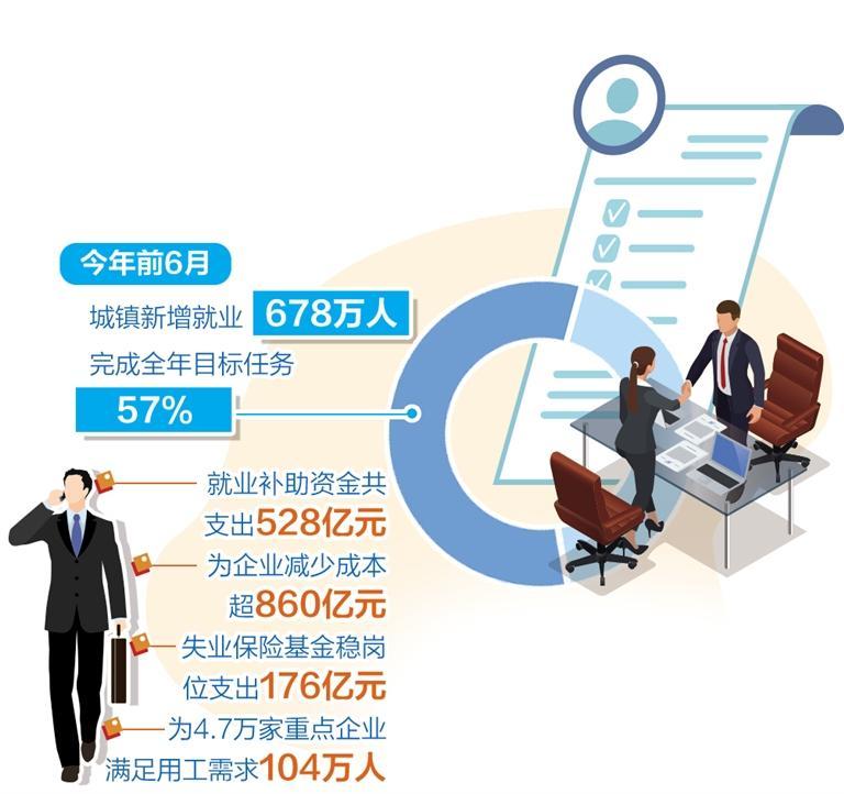 就業(yè)穩(wěn)定來自于經(jīng)濟(jì)運行趨勢企穩(wěn)向好,對就業(yè)支撐力不斷增強(qiáng)。就業(yè)優(yōu)先政策落實落細(xì)、穩(wěn)就業(yè)政策優(yōu)化調(diào)整、一次性擴(kuò)崗補助政策延續(xù)實施,有效激勵了企業(yè)積極吸納就業(yè)。數(shù)據(jù)顯示,上半年就業(yè)補助資金共支出528億元,階段性降低失業(yè)、工傷保險費率為企業(yè)減少成本超860億元,失業(yè)保險基金穩(wěn)崗位支出176億元。