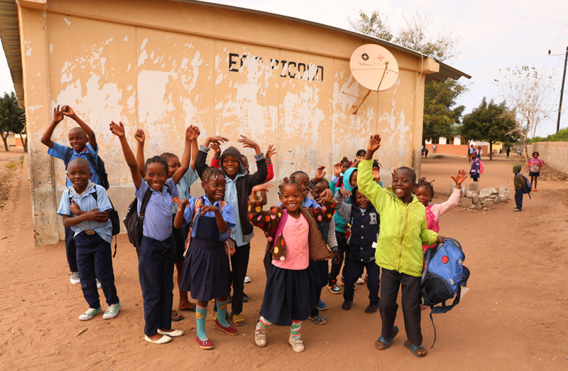 2023年7月25日,莫桑比克馬普托省皮科科村學(xué)校的孩子們站在裝有中國援助的衛(wèi)星電視接收天線的房屋前。新華社記者 董江輝 攝